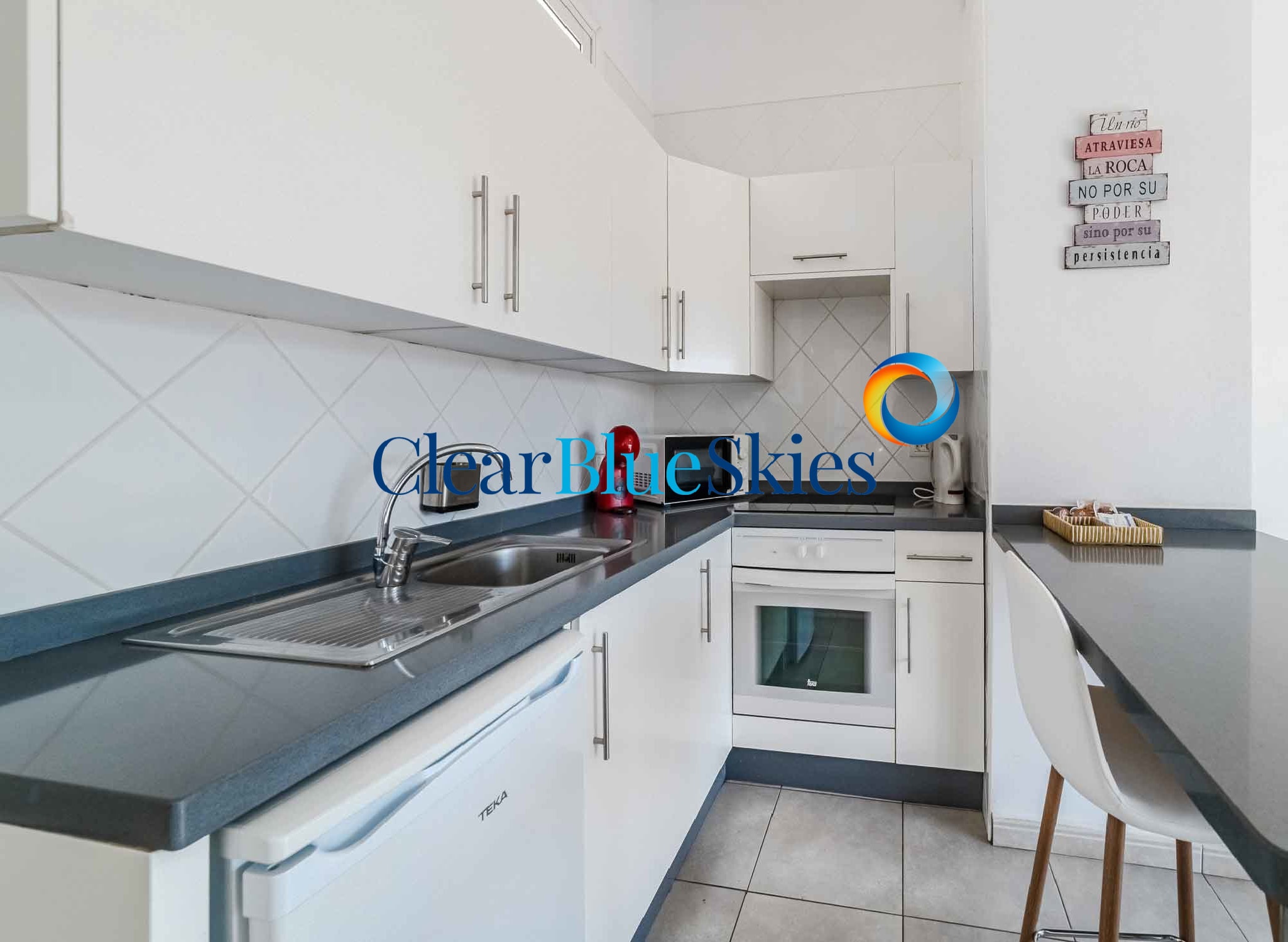 Clear Blue Skies is delighted to have been chosen as the exclusive agent to offer for sale this beautiful ideally located one bedroom apartment in the very popular and centrally located Parque Margarita complex in Los Cristianos, in the south of Tenerife.