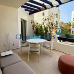 This luxurious top floor property is incredibly spacious with a living area of 100m² spread over two floors. On the lower level there is a double guest bedroom with en-suite bathroom and fitted wardrobes plus a guest toilet. The living-kitchen-dining space has an open plan concept and is bright and comfortable. The kitchen is modern and light with quality white units and a utility room. The living room and bedroom both lead out to a lovely terrace partially covered by a feature wooden pergola and with peaceful views over the gardens and pool.