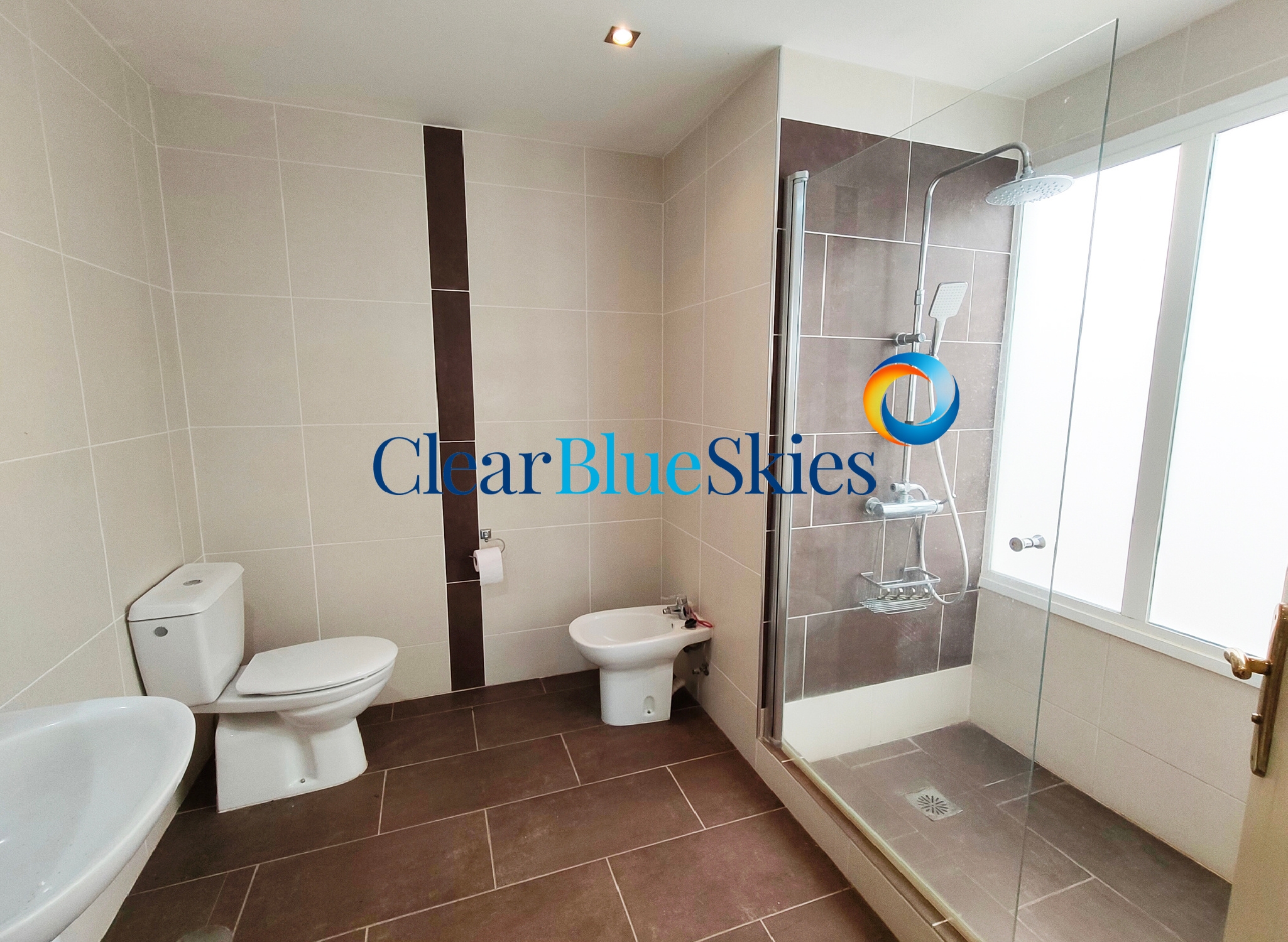 The lower level comprises two generously sized bedrooms, both with fitted wardrobes and direct access to a large, sunny south-facing terrace, creating an excellent indoor-outdoor living environment. The principal bedroom benefits from an en-suite shower room, while a second, separate shower room serves the additional bedroom.