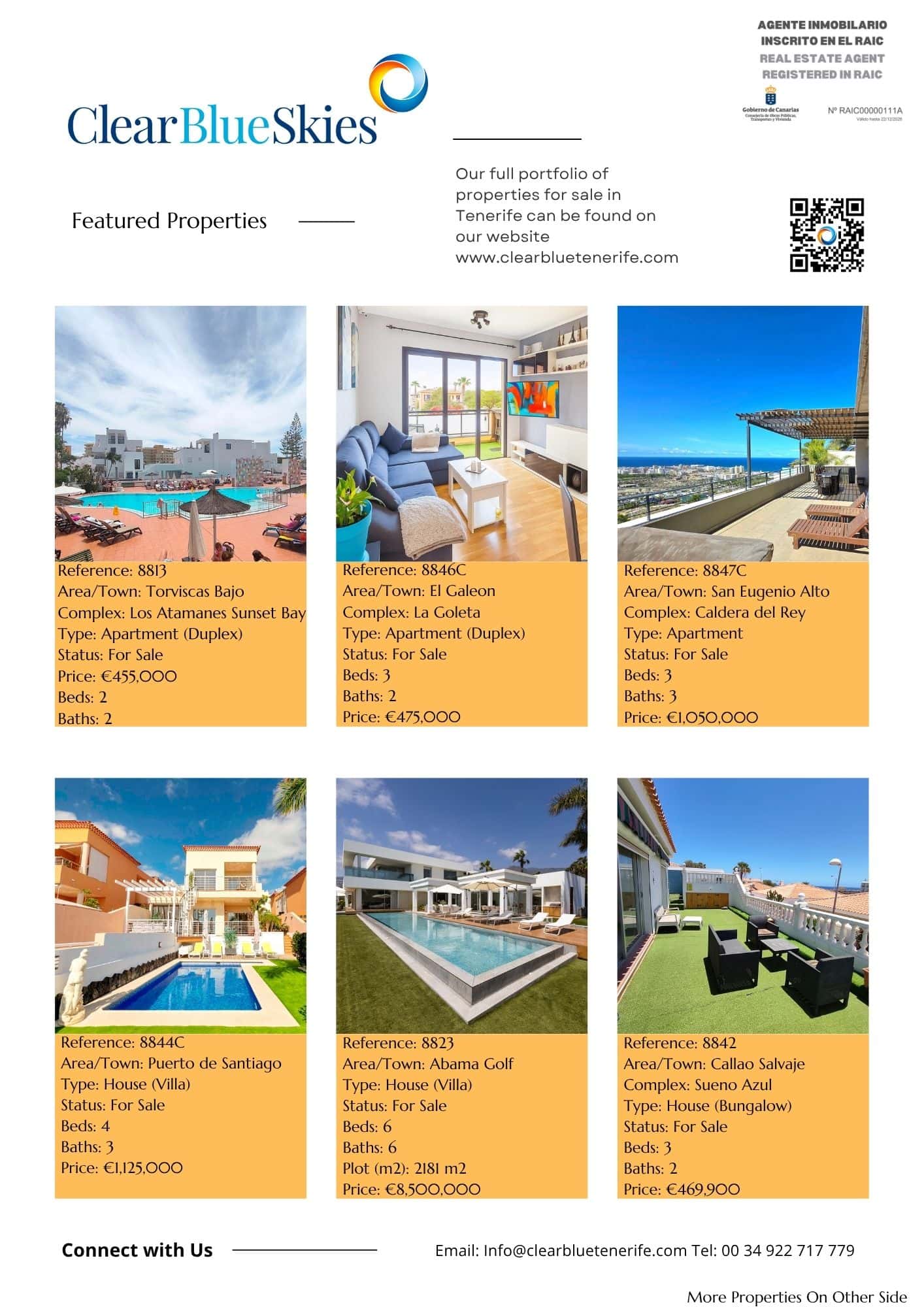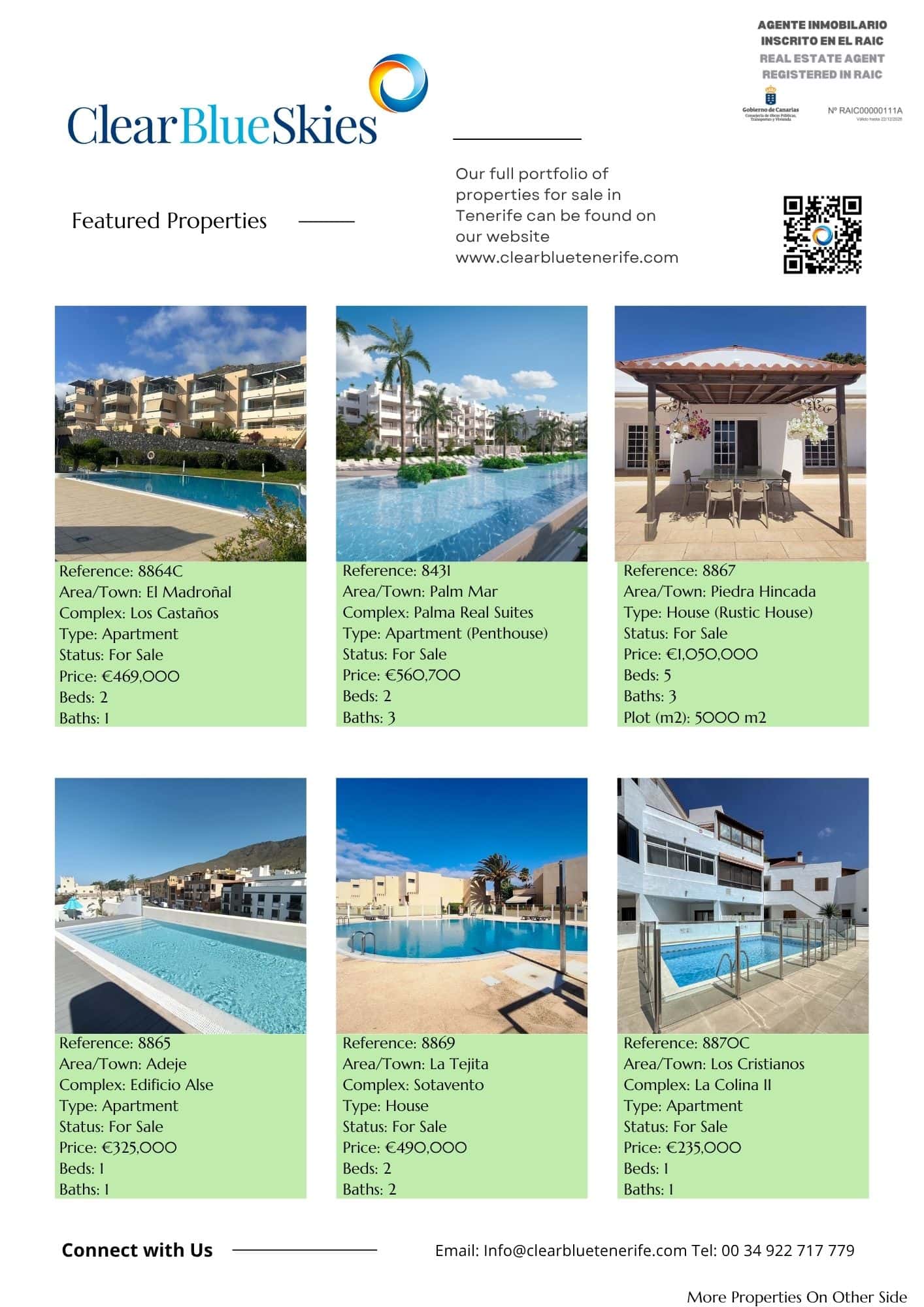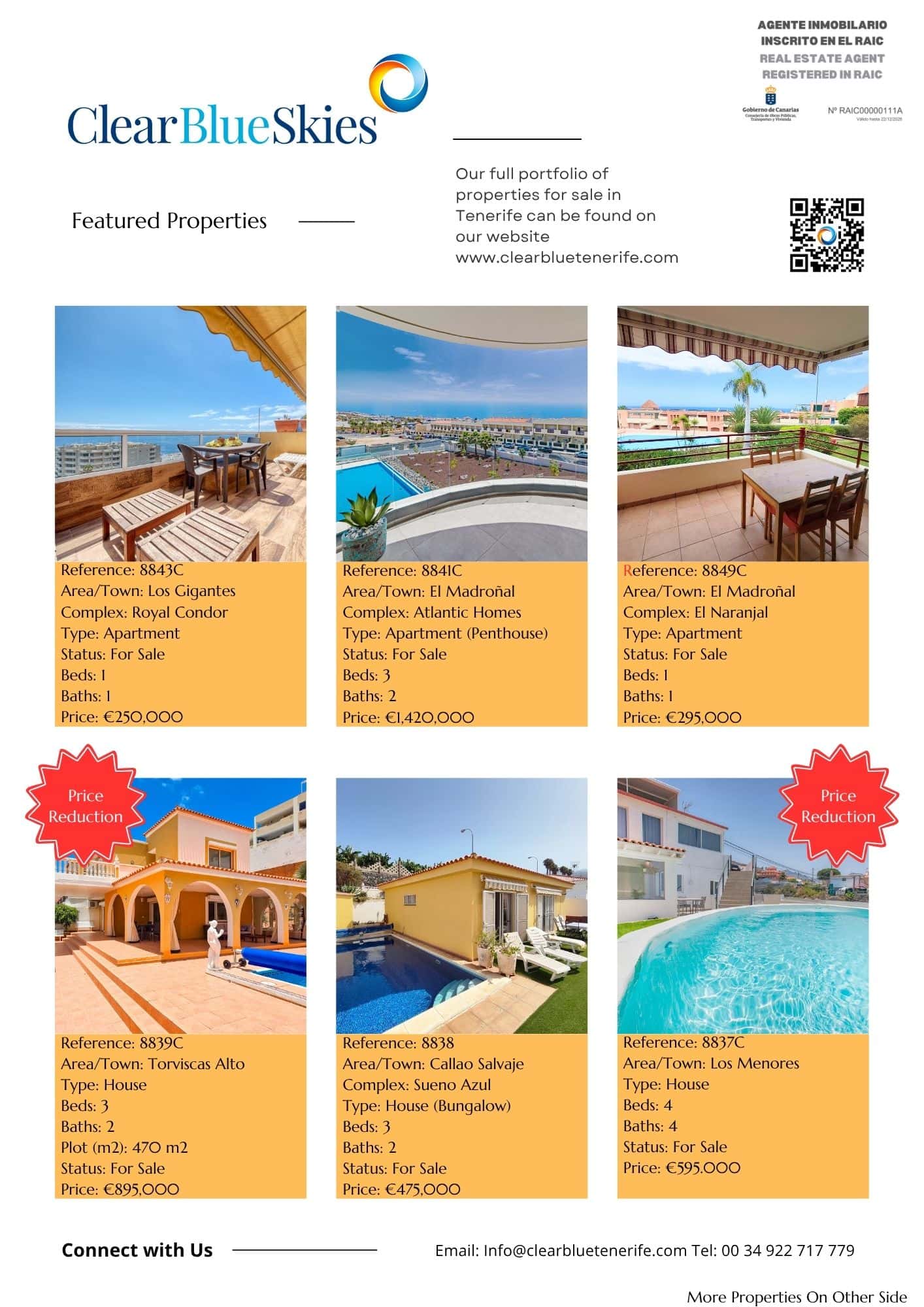 We always have a fabulous selection of Tenerife Property for Sale at Clear Blue Skies. Have a look through a few of our latest leaflets, if something catches your eye, get in touch!