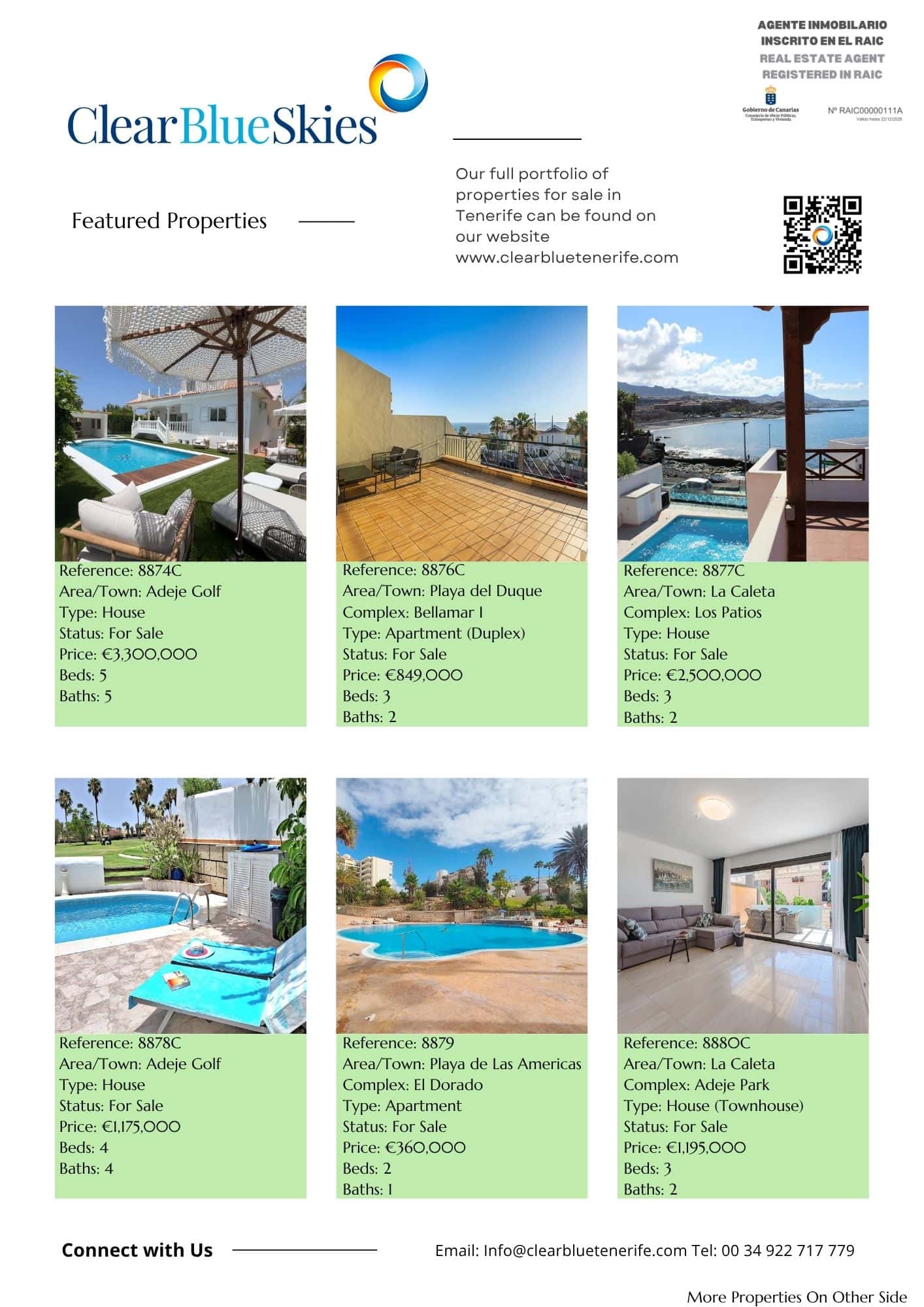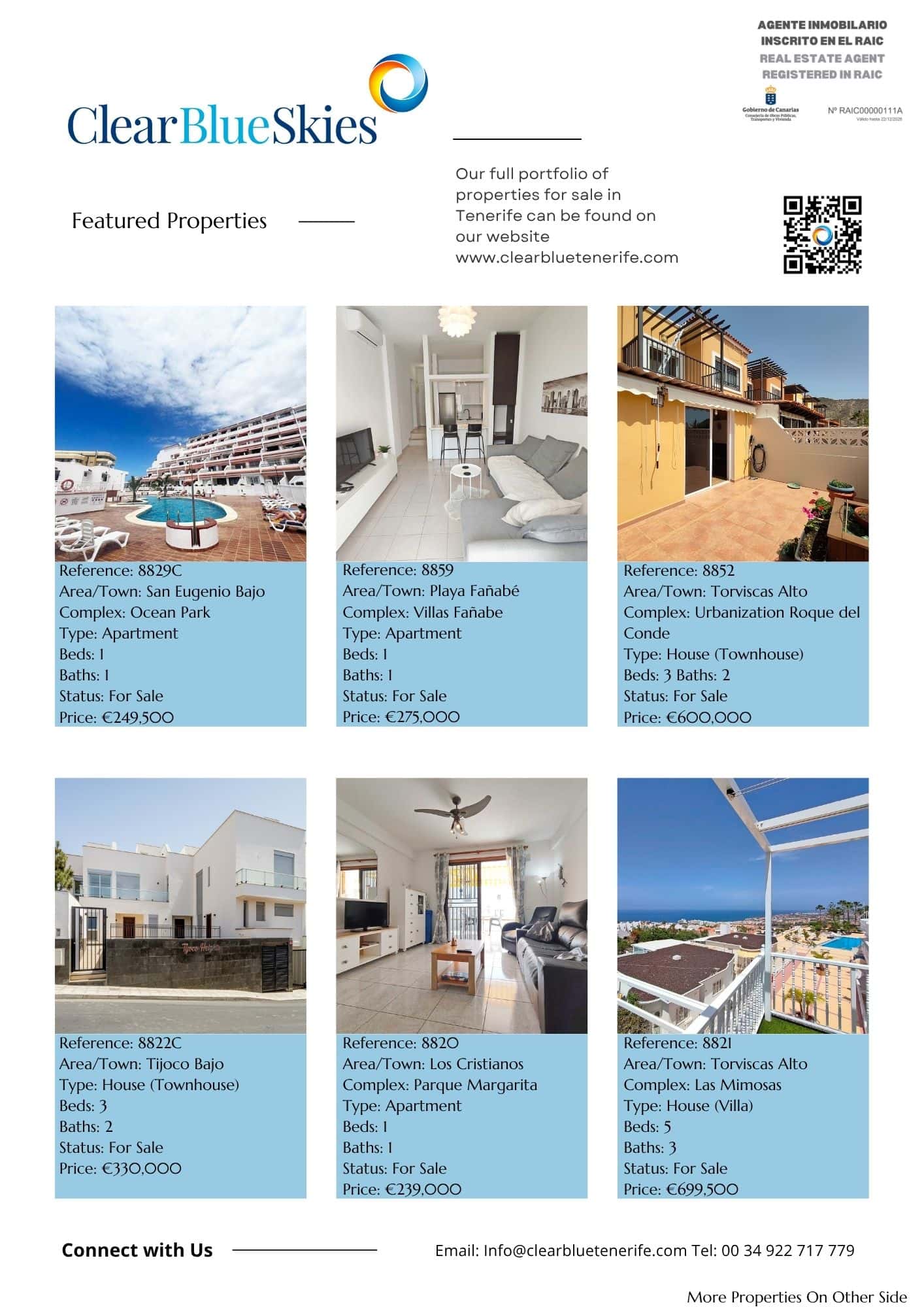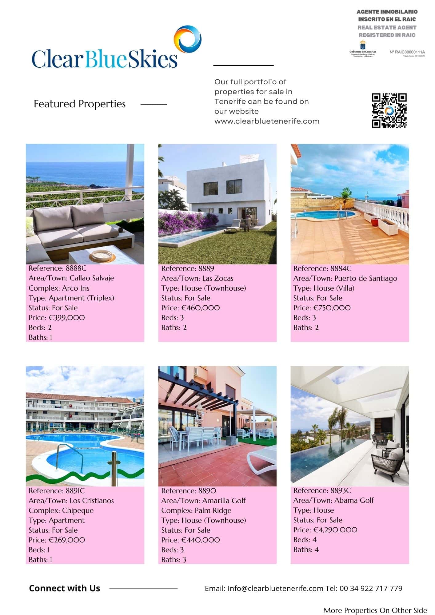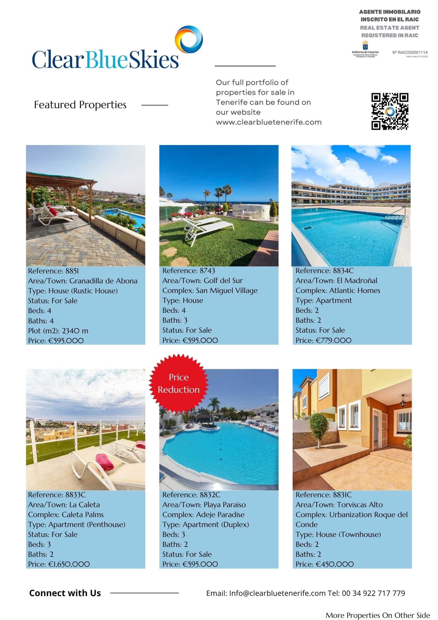 We always have a fabulous selection of Tenerife Property for Sale at Clear Blue Skies. Have a look through a few of our latest leaflets, if something catches your eye, get in touch!